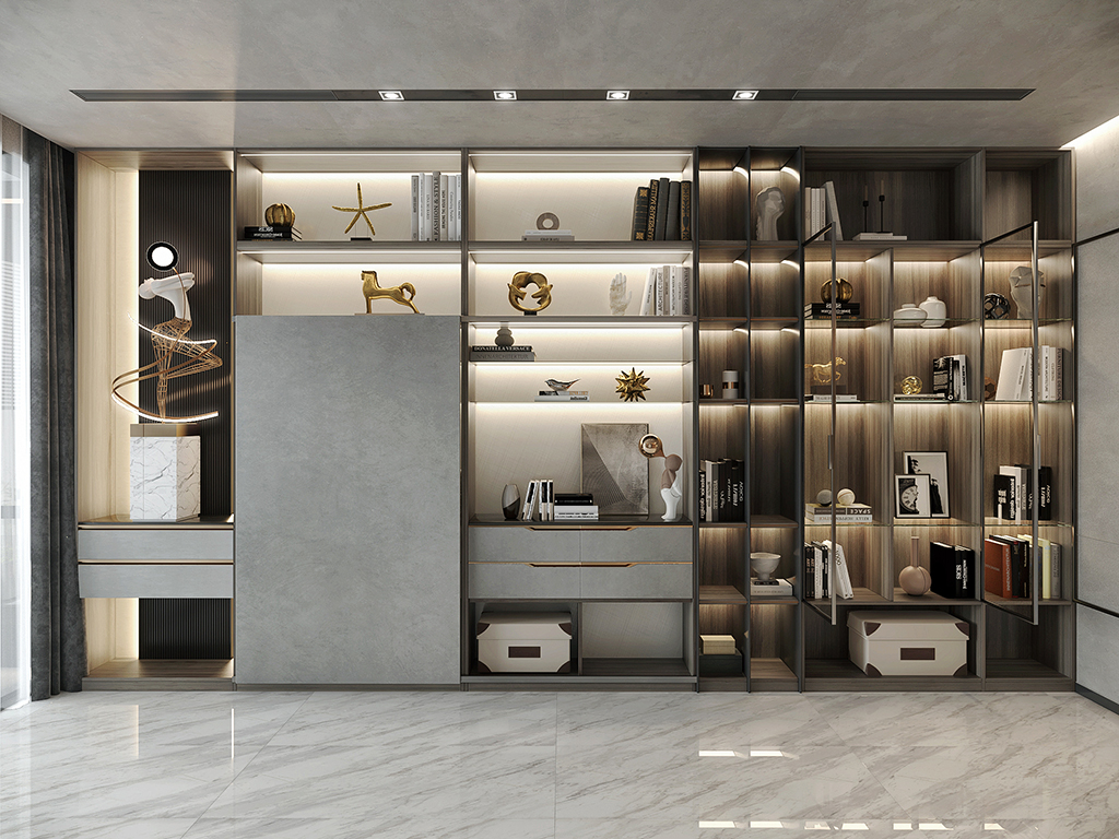 Materials: Timber veneer cabinetry, glass display shelving, integrated LED lighting, stone surfaces and metal detailing